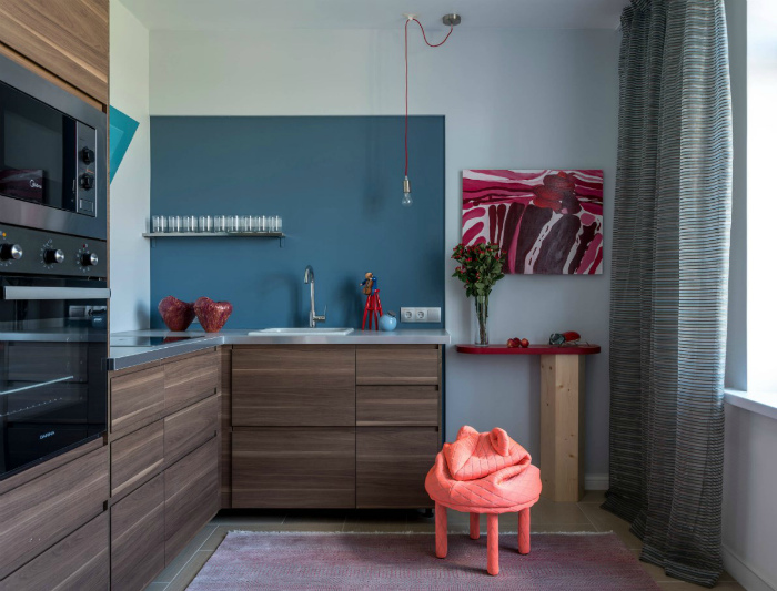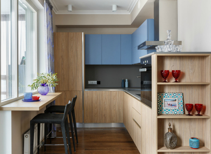 Кухня в стиле эклектика. | Фото: Уют в доме.Ру. Нестандартная кухня, в которой удивительным образом удалось сочетать коричневые шкафы и различные оттенки синего в отделке.