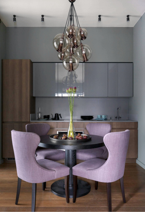 Кухня в классическом стиле. | Фото: Интерьеры, дизайн. Лаконичный кухонный гарнитур из дерева и стекла, массивный круглый стол, мягкие стулья приятного сиреневого оттенка и эффектная броская люстра - все это последние тенденции современного классического интерьера кухни.