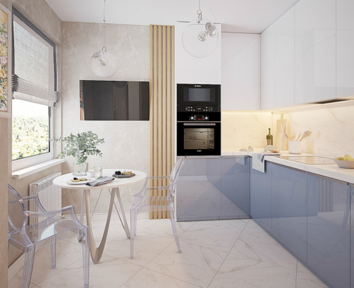 Светлая кухня с обеденной зоной. | Фото: Архимир. Светлая и очень уютная кухня, условно разделенная на две зоны: рабочую с глянцевым гарнитуром и обеденную с круглым столом и стульями из прозрачного пластика.