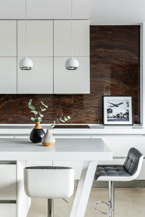 Контрасты в интерьере кухни. | Фото: Pinterest. Стильная кухня, в интерьере которой дизайнеры использовали принцип контрастов. Белая мебель выглядит очень эффектно на фоне глянцевого фартука цвета темного дерева.