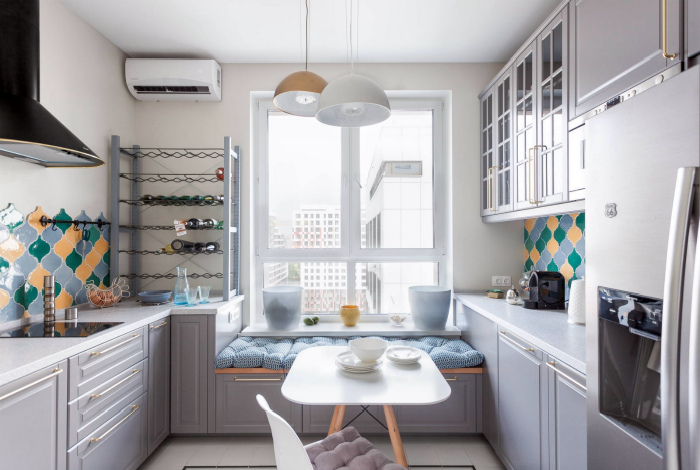 Светлая уютная кухня. | Фото: Design-homes.ru. Светлая и очень уютная кухня с белыми стенами, светло-серыми классическими шкафчиками, ярким фартуком из керамической плитки и очаровательным выдвижным диванчиком, скрытым под подоконником.
