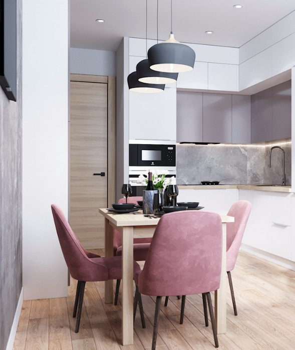 Элегантная светлая кухня. | Фото: Kuhnov.Ru. Белые гладкие фасады встроенных шкафчиков, фартук, стилизованный под серый мрамор, лаконичные светильники и обеденная зона, представленная деревянным столиком и мягкими стульями цвета пыльной розы. Да, бесспорно, эта кухня - настоящее воплощение элегантности.