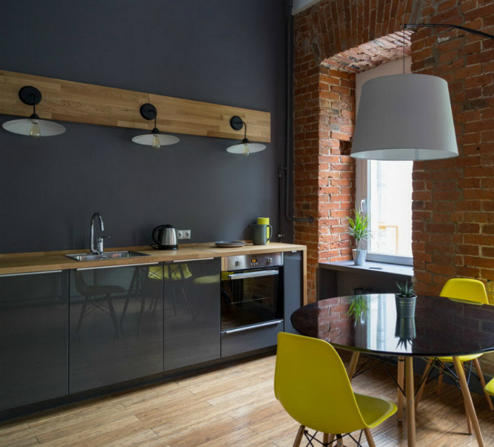 Кузня в стиле лофт. | Фото: 24segodnya.ru. Мы на Novate.ru обожаем интерьеры в стиле лофт. Примера ради обратите внимание на эту яркую кухню открытого типа с серым кухонным гарнитуром, грубой кирпичной стеной, яркими желтыми стульями и деталями из светлого дерева.