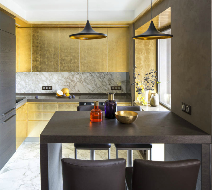 Золотые фасады и графитовые детали. | Фото: Houzz. Потрясающая кухня, в которой удивительным образом удалось сочетать простоту графита и роскошь золота. В качестве дополнительной детали дизайнеры использовали еще одну фактуру - мрамор. Его можно заметить в зоне фартука и на полу.