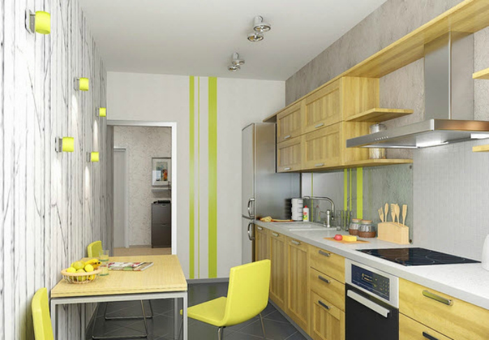 Светлая кухня с лимонными акцентами. | Фото: DesignMyHome. Стандартная небольшая кухня с белыми стенами, классическими деревянными шкафами и множеством мелких деталей яркого лимонного оттенка, которые задают тон всему пространству.