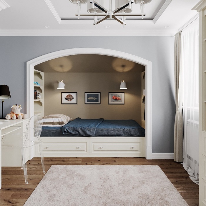 Если вы стали обладателем квартиры неправильной формы, не спешите расстраиваться. В таких помещениях есть очень много плюсов. Один из них – наличие алькова или углубления в стене. В нише можно разместить кровать, а рядом поставить офисный стол, таким образом совместив две зоны – для отдыха и для работы. Остальную площадь задействуйте под кухню и гостиную. Они могут быть как раздельными, так и объединенными – все зависит от исходной планировки жилья.