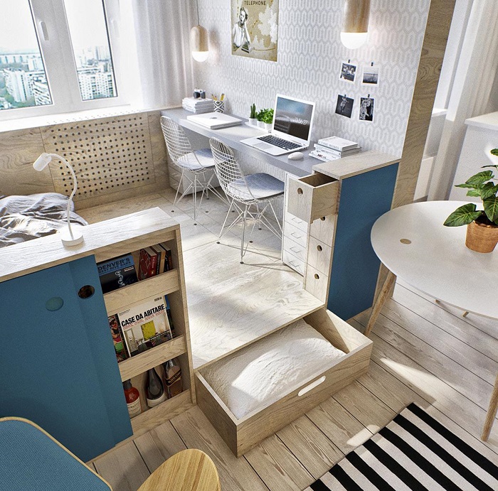 Подиум также является отличным решением для малогабаритки, особенно, если он многофункциональный и оснащен ящиками. На конструкции можно будет разместить кровать и рабочий стол. Так вы визуально создадите отдельную зону в однокомнатной квартире, не теряя драгоценные квадратные метры, как, например, в случае с дополнительной стеной. Однако стоит учитывать, что подиум – это все-таки отдельная комната со своим дизайном и набором мебели. Ваша главная задача – разместить нужные предметы таким образом, чтобы оставалось свободное место для маневров.