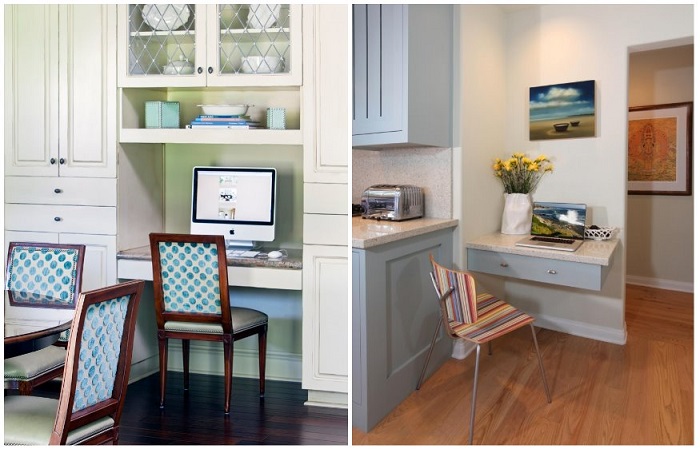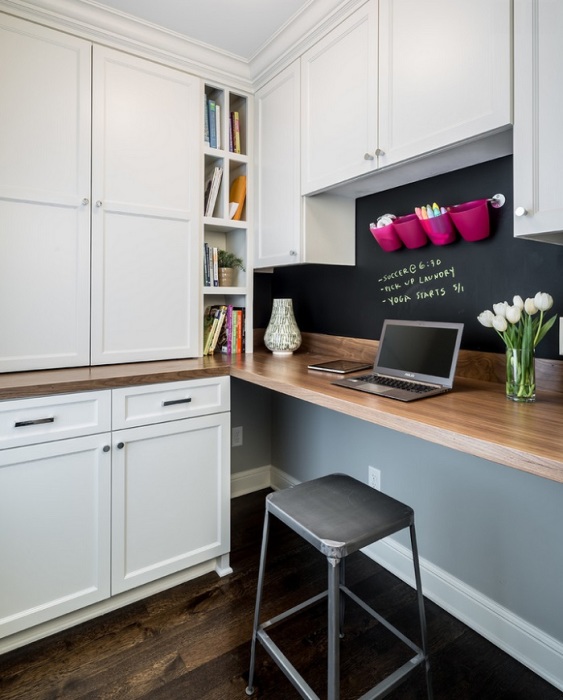 Если не хотите «ущемлять в правах» спальню, можете разместить рабочее место на кухне. Сразу предупреждаем, что такой вариант не подходит большим семьям и родителям с маленькими детьми. Лучше взять эту идею на вооружение, если вы живете один или со второй половинкой. Итак, для обустройства кабинета на кухне вам понадобится участок, наиболее удаленный от плиты и прочих загрязнений. Самый удачный вариант – столешница без нижних шкафчиков, чтобы вам было куда спрятать ноги. Приятным является тот факт, что классическая ширина рабочей поверхности на кухне составляет 60 см. Для офисной работы этой цифры также вполне будет достаточно. Фартук в этой зоне можно будет оформить в виде грифельной доски, чтобы делать там рабочие пометки или записывать рецепты.