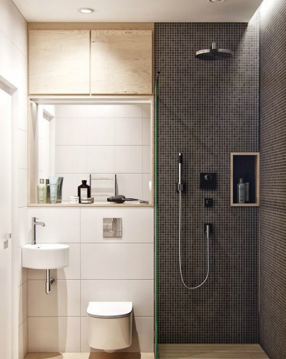 Зонирование при помощи цвета. | Фото: https://www.livemaster.ru. Небольшой санузел, условно разделенный на две части при помощи цвета и отделки. Зона умывальника оформлена с использованием широких белых панелей, а стены душевой кабинки выложены мелкой плиткой графитового цвета.