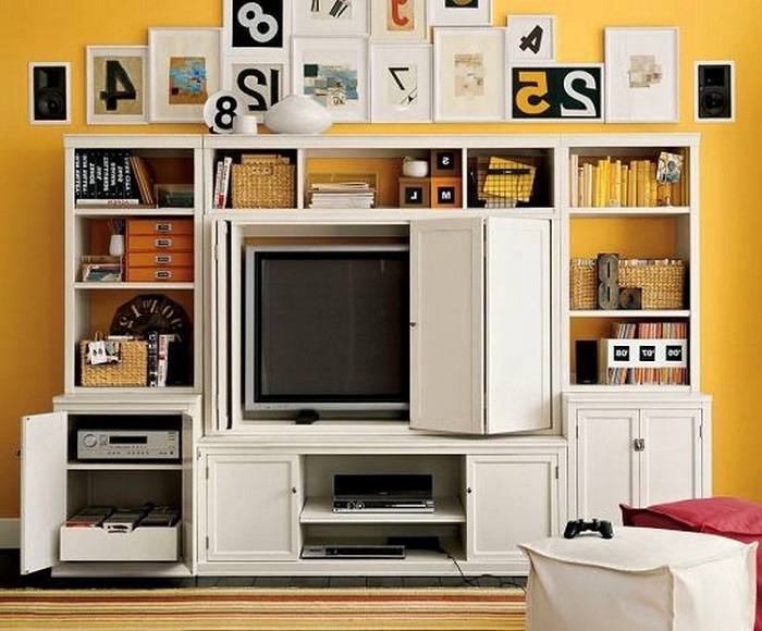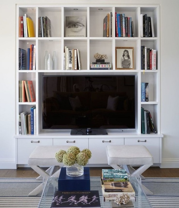 Телевизор можно спрятать в стеллаже за специальной загородкой. / Фото: vgostinoy.ru