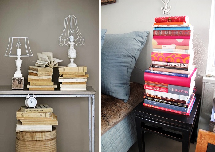 Например, ваза или статуэтка выглядят слишком мелко на фоне стены, поставьте их на две-три книги. В этом случае они будут выполнять роль своеобразного пьедестала для скульптуры. Этот же прием можно применить и в том случае, если одна лампа на прикроватной тумбе оказалась ниже другой. Подложив необходимое количество литературы, вы добьетесь идеальной симметрии. Также книги пригодятся в том случае, если нечем занять полки в квартире. Еще один вариант – размещать их на тумбах, комодах, стеллажах. Таким образом вы сможете превратить скучную однообразную мебель в яркий элемент интерьера.