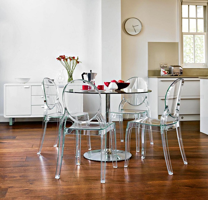 Прозрачная мебель сейчас находится в тренде. И это неудивительно, ведь она имеет свойство «растворяться» в интерьере. Стол и стулья из люсита или акрила идеально впишутся в обстановку даже самой маленькой квартиры, ведь они не будут «давить» и перегружать пространство. Можно начать с маленьких элементов, например, прозрачной лампы или полки. Поставьте на нее обычную стеклянную вазу с цветами, и вы заметите, как преобразилась окружающая атмосфера.