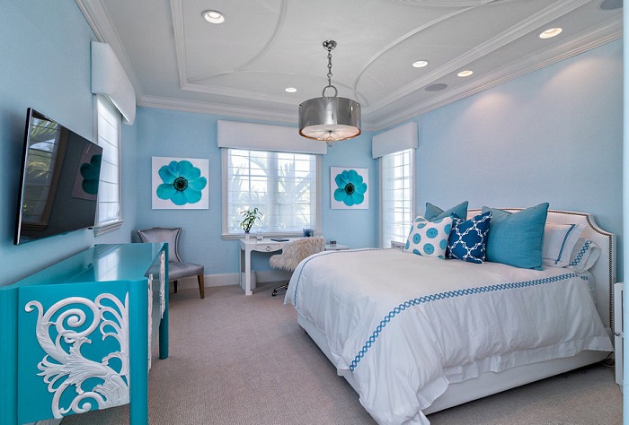 Голубой в оформлении спальни на разных поверхностях будет выглядеть по-разному. / Фото: Remont-samomy.ru