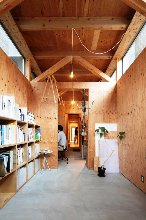 Учитывая катастрофическую нехватку земли в мегаполисах, японские архитекторы до такой степени научились изловчаться, что проектируют дома в любых условиях. На этот раз им достался узкий участок неправильной формы, окруженный высотными домами с окнами на торцах зданий, причем «втискивать» пришлось не только жилое помещением, но и офис, в котором владелец планировал открыть свое дело.