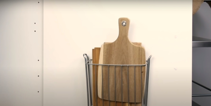 Разделочные доски бывают различных размеров и структуры. Желательно, чтобы на кухне было как минимум три доски: одна для разделки мяса, вторая для овощей и других продуктов, а третья для рыбы. Но на практике их бывает даже гораздо больше, поскольку сейчас вошла в моду красивая сервировка блюд прямо на деревянных дощечках. Однако в шкафу доски занимают много места, а на столешнице часто превращаются в неустойчивую конструкцию, которая портит легкость дизайна. Избежать этой проблемы помогает простое решение: нужно купить сетчатую корзину и повесить ее на внутреннюю часть дверцы шкафчика под раковиной. Туда поместятся все разделочные доски, где они не будут никому мешать.