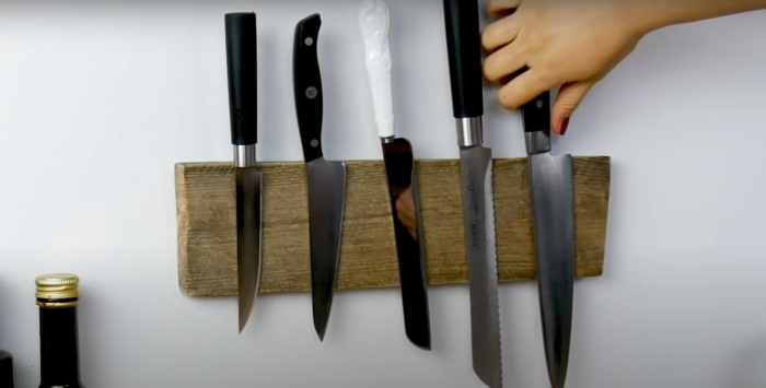 Магнитные доски признаны профессионалами кулинарии одним из самых лучших вариантов для безопасного и удобного хранения ножей. Однако этот вариант уже немного приелся и никого не удивляет. А вот деревянная доска, которая выполняет такую же функцию — это оригинально. И самая приятная новость заключается в том, что такое улучшение для кухни можно без особого труда сделать самостоятельно. Для этого нужно в выбранной деревянной доске сделать несколько круглых отверстий с помощью корончатого сверла, а затем поместить туда магниты и зафиксировать клеем. Теперь нужно только повесить магнитную доску на стену и можно прикреплять к ней ножи.