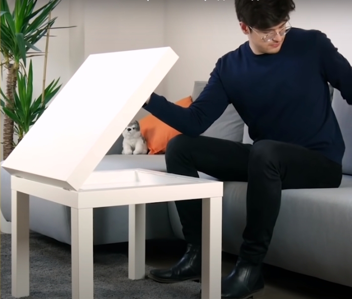 Компактная дешевая мебель — хорошая экономия для кошелька. Однако она зачастую маленькая и не особо функциональная. Эту проблему вполне можно исправить самостоятельно и добавить к обычному журнальному столику дополнительное место. Для начала у столика нужно открутить ножки и добавить внутренней глубины столешнице. Для этого по краям перевернутой столешницы закрепляем клеем для дерева или герметиком неширокие брусья. Затем и брусьев и доски делаем деталь таких же параметров и с одной стороны закрепляем ее на шарниры. С другой стороны делаем щеколду. Возвращаем столику ножки. Теперь это более вместительная мебель, которая под основной столешницей имеет скрытую зону для хранения.