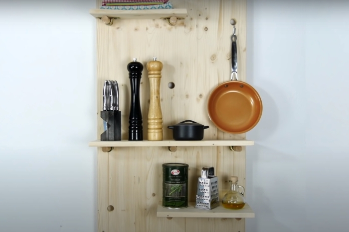 Готовая мебель не всегда идеально вписывается в интерьер и соответствует нашим задумкам. Поэтому нет ничего странного в том, чтобы изготовить оригинальный вариант своими руками. Например, многофункциональную полку с передвижными элементами. В деревянной основе под полку нужно подготовить 12 круглых отверстий. Сделать это можно с помощью дрели и коронки подходящего диаметра. Затем нужно выполнить 7 или больше деревянных колышков, которые будут закрепляться в этой основе. Чтобы они держались прочнее, полку лучше отодвинуть от стены. Сделать это помогут длинные саморезы по 10 см и надетые сзади шайбы. Несколько полочек разного размера можно будет перемещать по уровню и месту расположения. А неиспользованные отверстия и колышки отлично приспосабливаются вместо крючков.