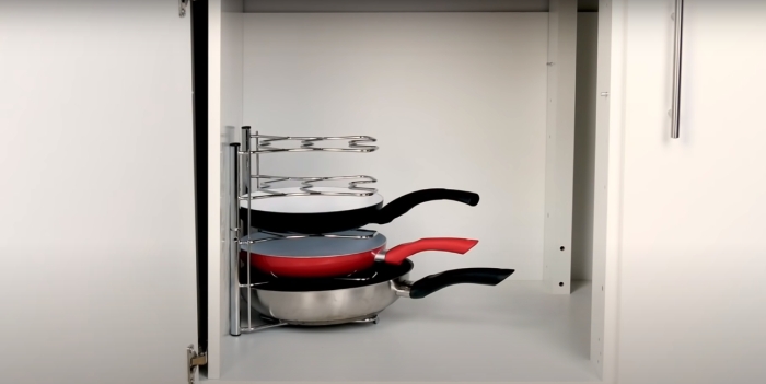 Хранение сковородок в кухне с небольшой площадью может стать серьезной проблемой. Им постоянно не хватает места или они не оставляют свободного пространства для другой посуды. Чтобы исправить эту проблему, можно купить специальный держатель и закрепить его в шкафу под мойкой или другом большом шкафу с простыми открывающимися дверцами. Удобное и доступное местоположение, а также экономия места в основных шкафах — это весомое преимущество.