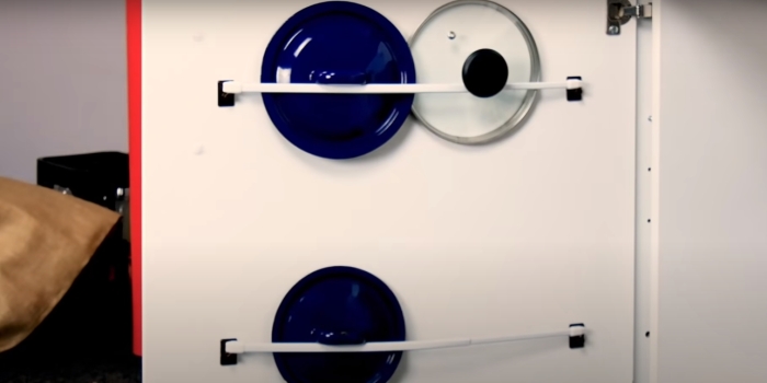 Крышки неудобно хранить вместе с кастрюлями и сковородками, поскольку так они занимают гораздо больше места. Однако и самостоятельно они превращаются в гремящую и сползающую кучу, которая грозит разлететься в любую секунду. Чтобы правильно и удобно организовать хранение, можно использовать эту идею: прикрепить на внутренней части дверцы шкафа крючки на клейкой основе, а за тем на них закрепить планку. Теперь в эту конструкцию можно класть крышки, которые будут висеть и при этом не занимать свободное пространство шкафа.