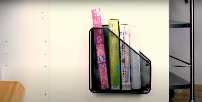 С таким дополнением на кухне прибавится больше порядка. В подвесной отсек на боковой части шкафа можно складывать рулоны пергамента, фольги, бумажных полотенец, моющие средства и другие кухонные принадлежности, которые не так часто используются, но все же занимают много места. Разделив их по зонам, можно значительно сэкономить пространство и облегчить доступ к каждому предмету.