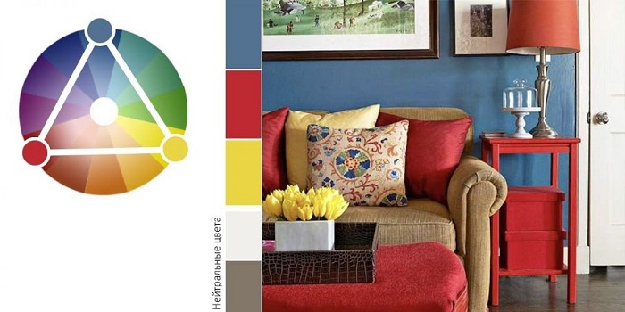 В отличие от любого нейтрального цвета, который сочетается с огромным количеством оттенков, идеальную пару для красного подобрать не так просто, ведь он является доминирующим. Чтобы существенно упростить свою задачу, при подборе тонов пользуйтесь цветовым кругом Иттена. С его помощью можно с легкостью подобрать цвета, которые хорошо сочетаются друг с другом и гармонично смотрятся в интерьере. Если говорить о красном цвете, то его компаньонами являются желтый и синий. Необходимо лишь правильно подобрать их оттенки, учитывая тон красного цвета. Они должны находиться на одинаковом удалении от центра круга.