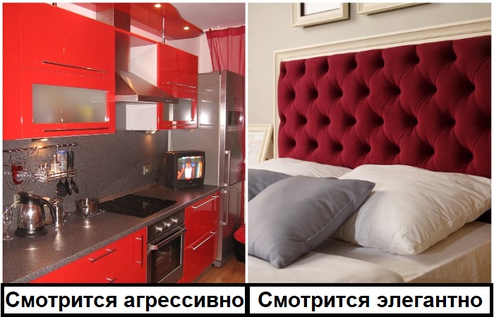 Восприятие красного цвета во многом зависит от его фактуры. Так, например, если вы подберете для кухни глянцевый гарнитур, скорее всего он будет выглядеть слишком агрессивно и вызывающе. А вот бархатное изголовье винного оттенка или обивка на деревянном стуле создадут совсем другое впечатление – они добавят уюта и умиротворения. В целом, лучше всего в интерьере смотрится матовый красный, слегка приглушенных оттенков.