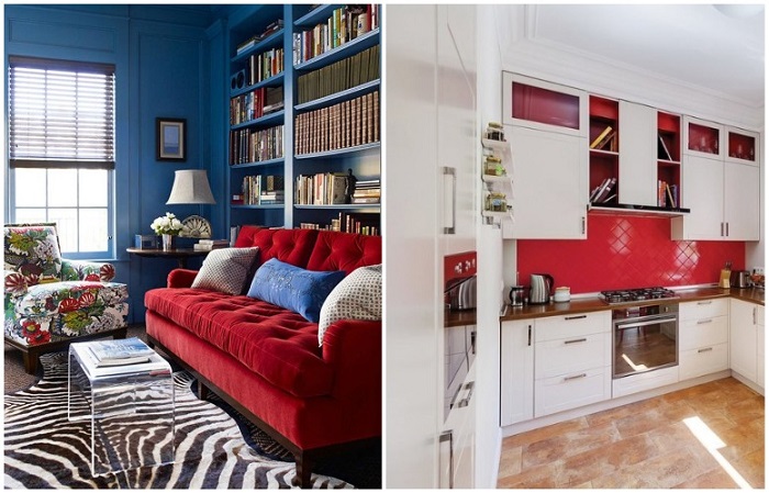 Если в рамках жилых помещений вы не готовы на эксперименты и яркие цветовые решения, оставьте их для кухни, прихожей, ванной комнаты, кабинета. Это отличный способ добавить яркие оттенки в интерьер, привлечь внимание к деталям, поднять настроение, но при этом не устать от них за короткий период времени. К тому же красный цвет помогает взбодриться, повысить уровень работоспособности, что является отличными свойствами для кабинета, но неудачными для спальни или гостиной.