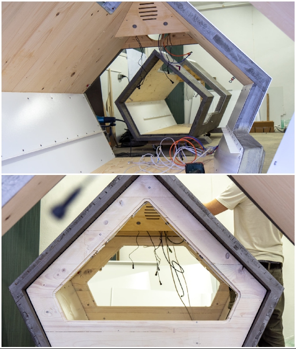 Авторы идеи консультировались со специалистами из разных областей и даже проводили реальные испытания, чтобы правильно подобрать сочетание материалов твердой древесины, из которой состоит основной корпус, а также металлических деталей, способных выдержать интенсивную очистку. Позаботились и о выборе специальных пропиток для сохранения древесины снаружи конструкции и поддержания соответствующей гигиены внутри капсулы, особенно это касается спального места.