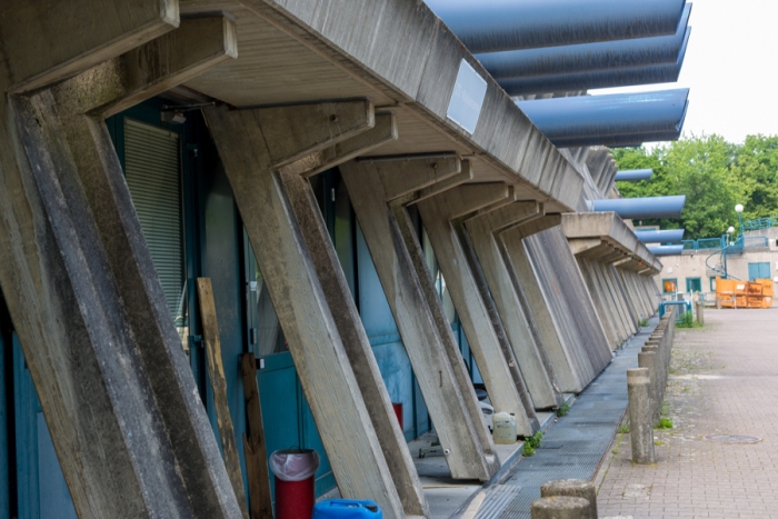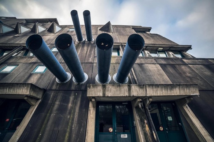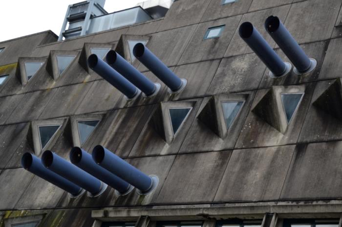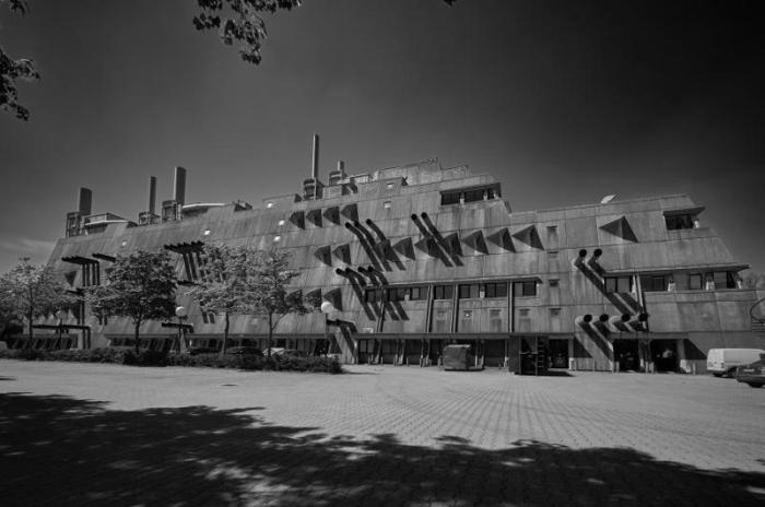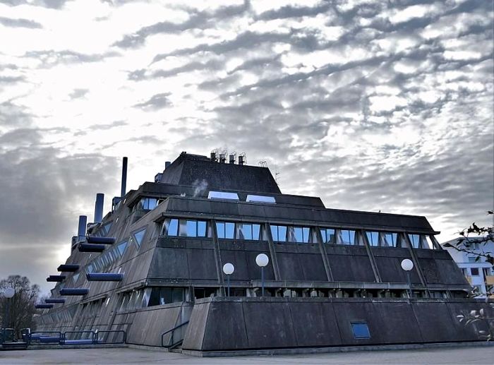Оригинальные трубы и окна - не просто украшение здания. /Фото: wikimapia.org Таким образом, авторы проекта сумели вписать все функциональные детали в общую концепцию фасада здания, выполненного в редком ныне архитектурном стиле брутализма. Вот только процесс строительства сооружения оказался настолько же примечательным, насколько был создан фасад сооружения, однако с неприятным осадком. Возводить монструозное здание начали в 1971 году, но работы затянулись на долгое десятилетие. Более того: по информации Novate.ru, за эти годы окончательная стоимость строительства выросла аж в тридцать раз - с четырех до ста двадцати миллионов дойчмарок. Причиной этого скачка цифр в смете были поистине колоссальные размеры казнокрадство и хищение средств.