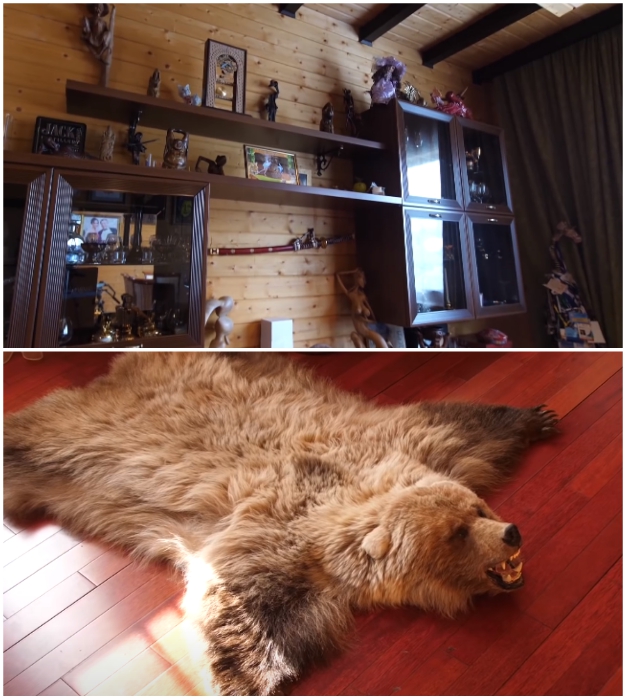 Коллекция статуэток и шкура медведя украшают гостиную.