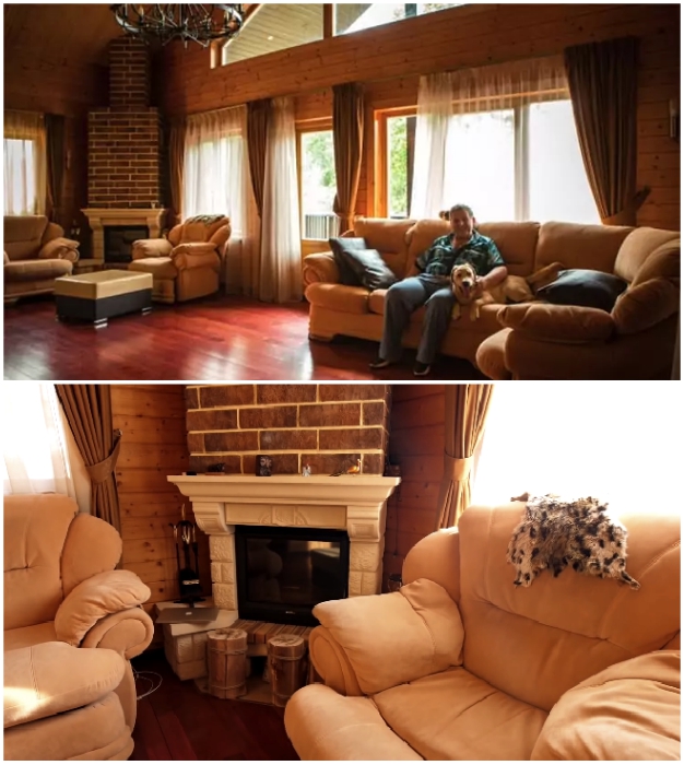 Особенное внимание он уделил гостиной-столовой, в которой нашлось место и для настоящего дровяного камина, и для роскошного углового дивана с двумя креслами и подставкой для ног, обитыми натуральной кожей молочного оттенка. Там же установлен выставочный шкаф, в котором находятся знаменитая коллекция экзотических статуэток, изображающих утонченные женские силуэты.