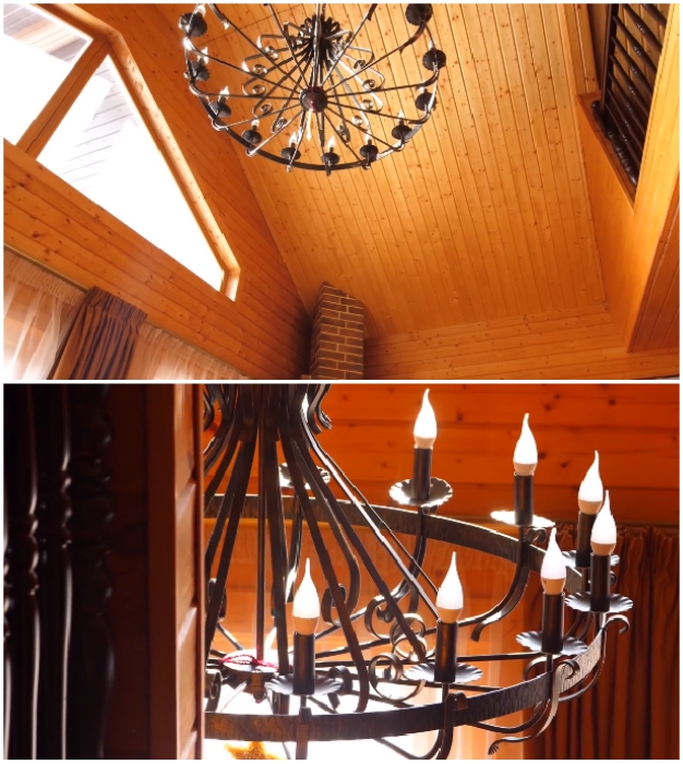 Массивная кованая люстра стала украшением центральной части загородного дома.