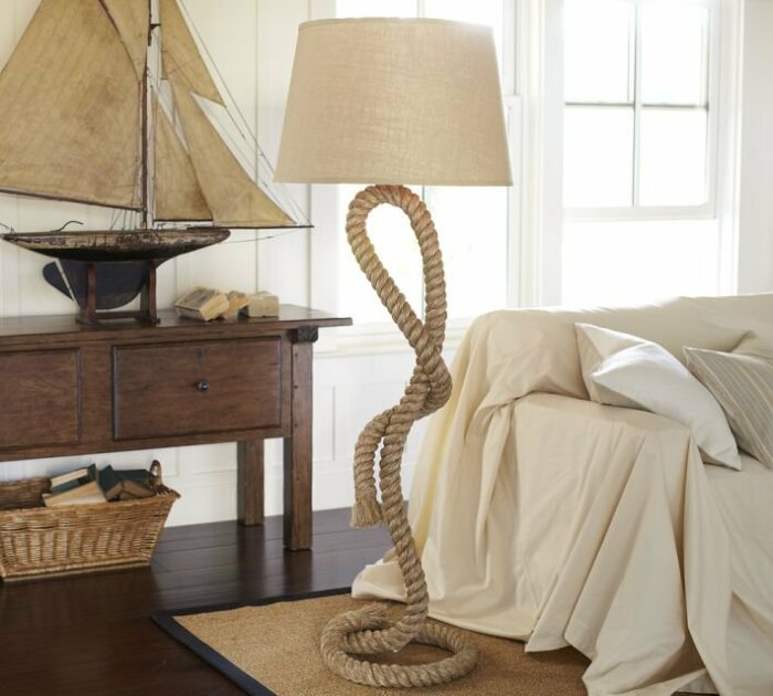 Не менее оригинально смотрятся и напольные светильники, задекорированные веревкой. Для этого можно сделать держатель необычной формы, а потом обмотать его веревкой или продеть внутри, чтобы казалось, будто светильник держится на веревке, которая застыла в неестественном положении.