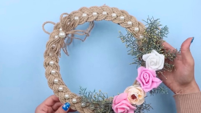 Для изготовления такого венка понадобится картонная основа. Вырезаем круг подходящего диаметра из плотного картона, а затем на него с помощью горячего клея наматываем веревку. Круги веревки должны плотно ложиться друг к другу и под каждым из них должно быть достаточное количество свеженанесенного клея. После этого сверху приклеивается любой желаемый декор в виде бусин, лент, искусственных или натуральных веточек, ягод и цветов, шишек.