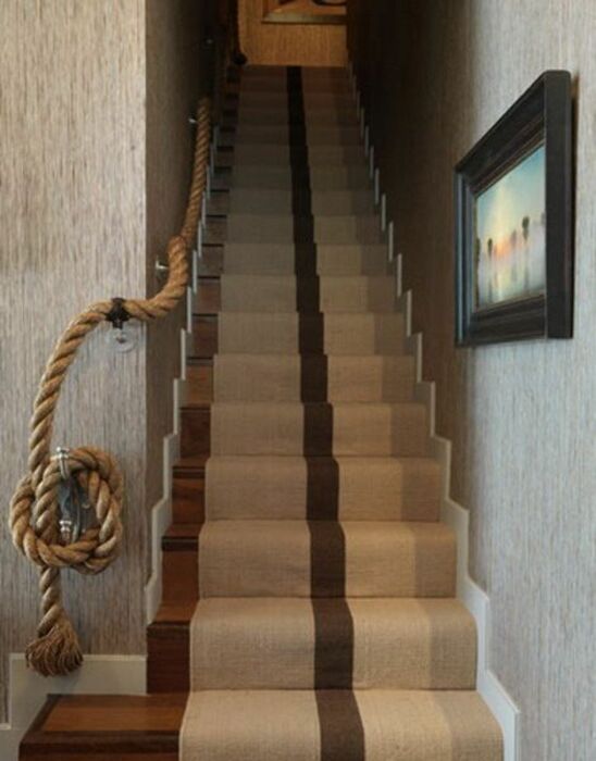 Перила возле лестницы выполняют не только полезную роль, но и эстетическую. Поэтому стоит задуматься, а не сделать ли их оригинальными и своими руками. Помочь в этом запросто может длинный толстый канат, который продевается в специальные держатели на стене или на краях лестницы. Чтобы оформление смотрелось непринужденно, между отдельными отсеками веревка должна немного провисать.