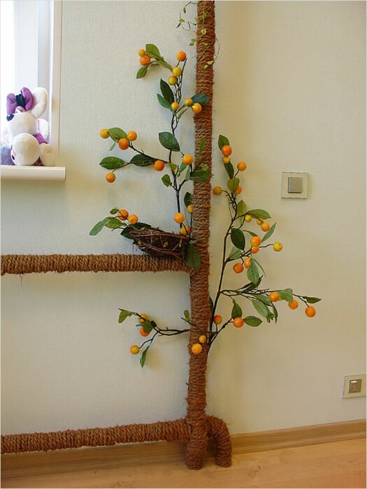 Стандартные трубы отопления и водоснабжения могут испортить впечатление даже от самого красивого интерьера. Чтобы этого избежать, можно прибегнуть к оригинальным решениям, например, замаскировать трубу с помощью веревки. Плотно обмотав ее по всей протяженности и добавив веточки с листьями или даже плодами, довольно просто сделать имитацию красивого дерева. Очень простая по воплощению задумка, которая смотрится просто волшебно.