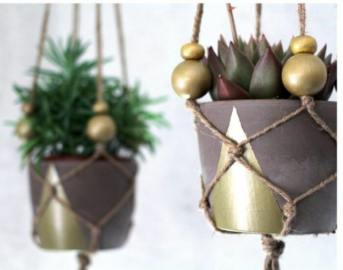 Из простой веревки всегда можно сделать дополнение для горшков, которое позволит подвесить их в нужных местах комнаты. Подвесной сад будет смотреться оригинально и красиво, при этом выполнить кашпо из веревки очень просто: сначала нужно сделать несколько узелков, начиная снизу горшка, который пока не заполнен грунтом, а затем пойти дальше, равномерно распределяя веревку. Завершающим этапом можно добавить несколько бусин, нанизанных на веревку, чтобы украшение смотрелось более нарядно.