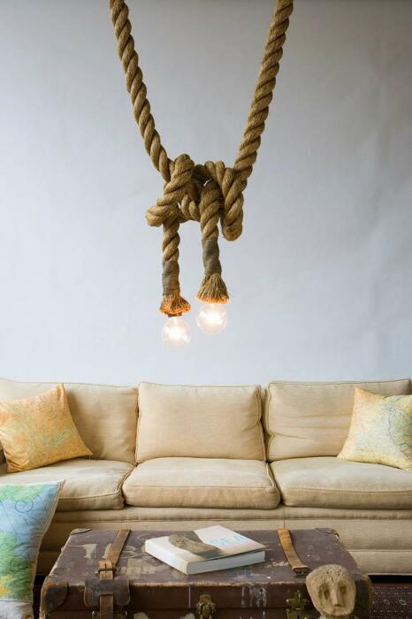 С помощью веревки можно украсить и освещение. Существует несколько вариантов декора. Например, можно спрятать внутри каната провод и оставить видимыми только лампочки, чтобы казалось, что они выходят прямо из веревки. Можно сделать более сложную конструкцию из металлической основы, которая впоследствии обматывается веревкой и становится более естественной и уютной.