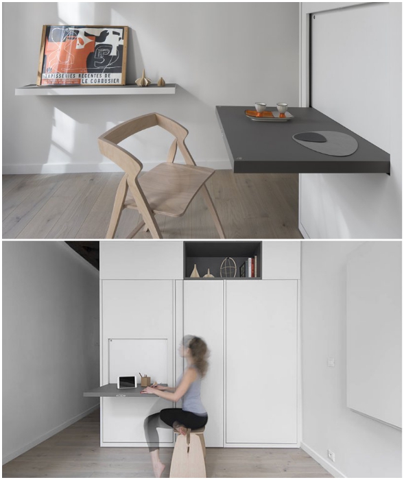 Организация домашнего офиса: Еще один откидной стол спрятан на стене комнаты. В сложенном виде он представляет собой некий арт-объект, а вот если его разложить, то получается отличное рабочее место, на котором поместится не только ноутбук, но и чертежи, ведь реконструкцию комнату заказала девушка архитектор, планирующая работать дома.