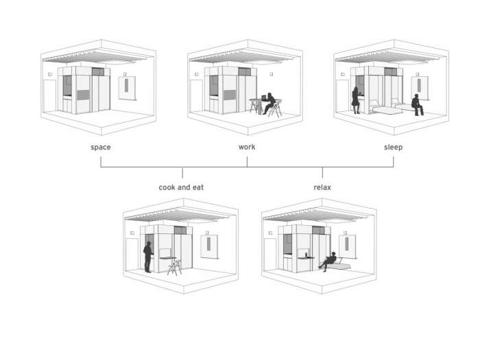 В нем нашлось место для двух кроватей, которые прячутся за ненадобностью в шкаф, а между ними есть еще потайная дверь, ведущая в ванную комнату. На одной из свободных сторон модуля закреплен откидной столик, который может служить в качестве рабочей поверхности во время приготовления пищи или как обеденная зона.