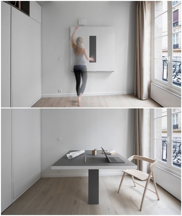 Специалисты архитектурной студии EDB умудрились трансформировать миниатюрную комнату площадью 16 кв. м в самом сердце Парижа. Несмотря на ограниченное пространство, дизайнерам удалось создать многофункциональную квартиру, в которой можно не только жить в комфортных условиях, но и плодотворно творить.