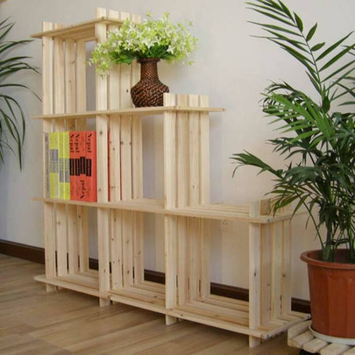Такие подставки можно с легкостью сделать самостоятельно. Понадобится просто правильный расчет, несколько полочек и брус для их соединения. Оригинальности разноуровневым подставкам добавляет стилизация в двух цветах.