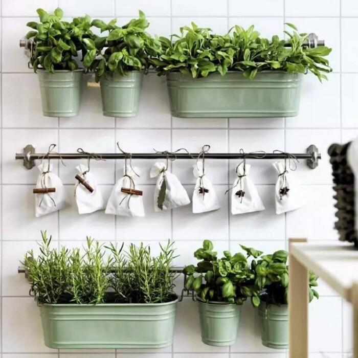 Очень оригинально и непосредственно смотрятся металлические подставки в виде ведерок или тазов, закрепленных прямо на стене. Особенно органично они сочетаются с плиткой. На кухне в таких подставках можно высадить травы и специи, которые потом добавлять в чай или блюда — удобно, практично и очень полезно.