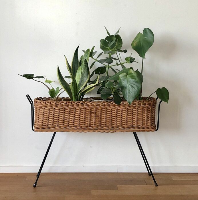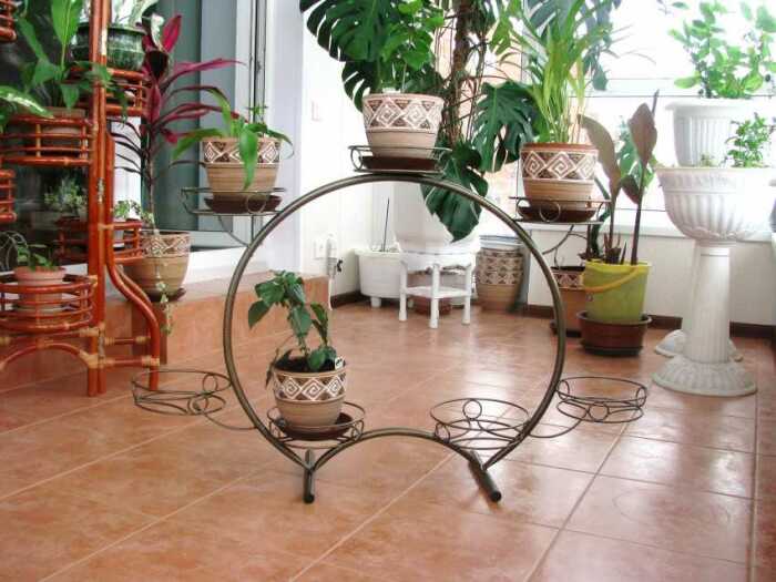 Такую конструкцию также очень легко выполнить самостоятельно. Из тонких металлических прутьев сваривается каркас на ножках, в который впоследствии ставится плетеная корзина. В зависимости от размеров планируемого зеленого уголка можно подобрать корзину разных размеров и формы. Подставку можно сделать на нескольких уровнях — тоже будет смотреться очень эффектно.