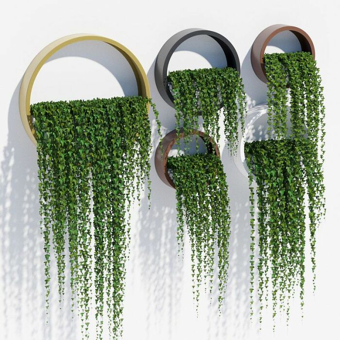 Круглые подставки, закрепленные прямо на стене, вместе с правильно подобранными растениями помогут создать иллюзию красивого зеленого водопада прямо в доме. За счет того, что в горшках находятся пышные вьющиеся цветы, их практически не видно, особенно если они сливаются со стеной. Таким образом, кажется, что потоки зеленой «воды» выходят прямо из стены. Очень эффектное и стильное решение для любого интерьера.