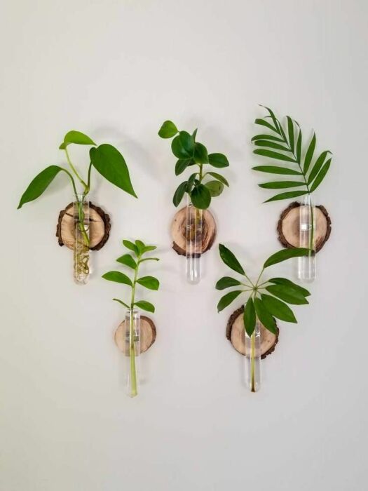 Красивые подставки для растений с естественным шармом и простотой. На срезы дерева с выразительной фактурой нужно наклеить пробирки. Тогда налив в них воду, можно поставить туда росточки комнатных растений, которые со временем пустят корешки и будут расти прямо там. Главное чтобы вода была качественной и никогда не испарялась полностью — периодически ее нужно подливать.