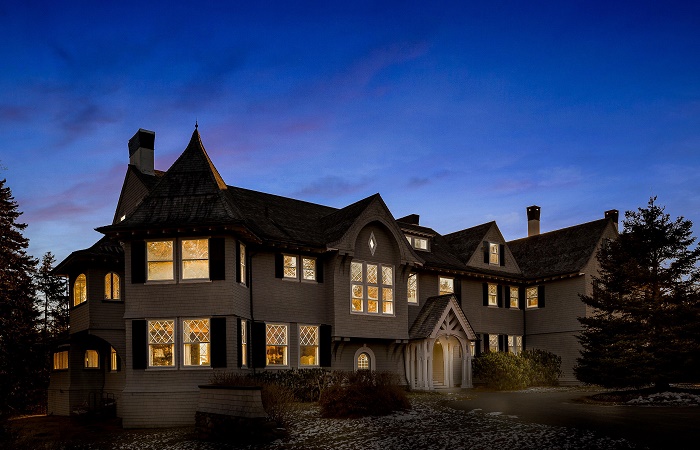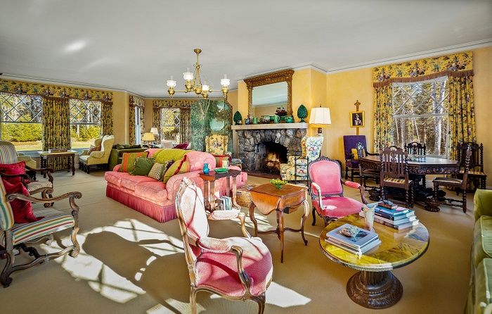 Старинный камин, облицованный натуральным камнем, расположен в главной гостиной особняк (Айлсборо, штат Мэн). Интересный факт: Особняк в классическом стиле был построен в одноименном городе Islesboro на частном острове семьей банкиров еще в 1903 г. Он расположен на лесистом участке земли, который граничит с побережьем Атлантического океана. Поскольку есть выход к береговой линии, семья имеет еще и собственный глубоководный пирс в гавани, и личный пляж. И это не считая прекрасные поля с видом на океан, лес, несколько садов и природные зоны отдыха, доступные только семье Траволты и их гостям.