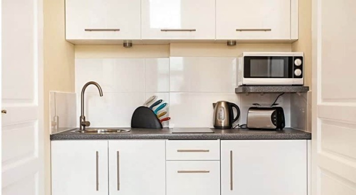 Перед тем как покупать или заказывать мебель, планировку нужно тщательно продумать. Если возле стены окажется ящик, дверцы которого раскрываются нараспашку, то одна из них может быть с ограниченной амплитудой. Решить проблему поможет фальш-панель или особые петли, благодаря которым дверца будет раскрываться полностью. Лучше обсудить этот вопрос заранее с мастерами, которые будут устанавливать кухонную стенку.