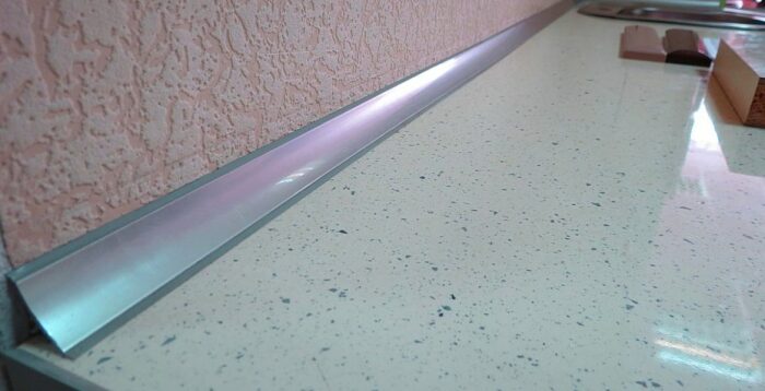 При сведении столешницы и фартука на кухне между ними обычно образуется небольшая щель. Естественно, что ее нужно как-то закрыть и замаскировать, чтобы это смотрелось красиво и эстетично, а также не стало местом скопления грязи. Довольно популярное решение среди потребителей — плинтус. Он бывает пластиковый или из искусственного камня, в зависимости от того, из какого материала была выбрана столешница. Однако дизайнеры рекомендуют не использовать ни один из этих вариантов. Лучшим решением будет поставить фартук на столешницу, а не приводить столешницу к фартуку, тогда зазор будет минимальным и установка плинтуса вообще не понадобится.